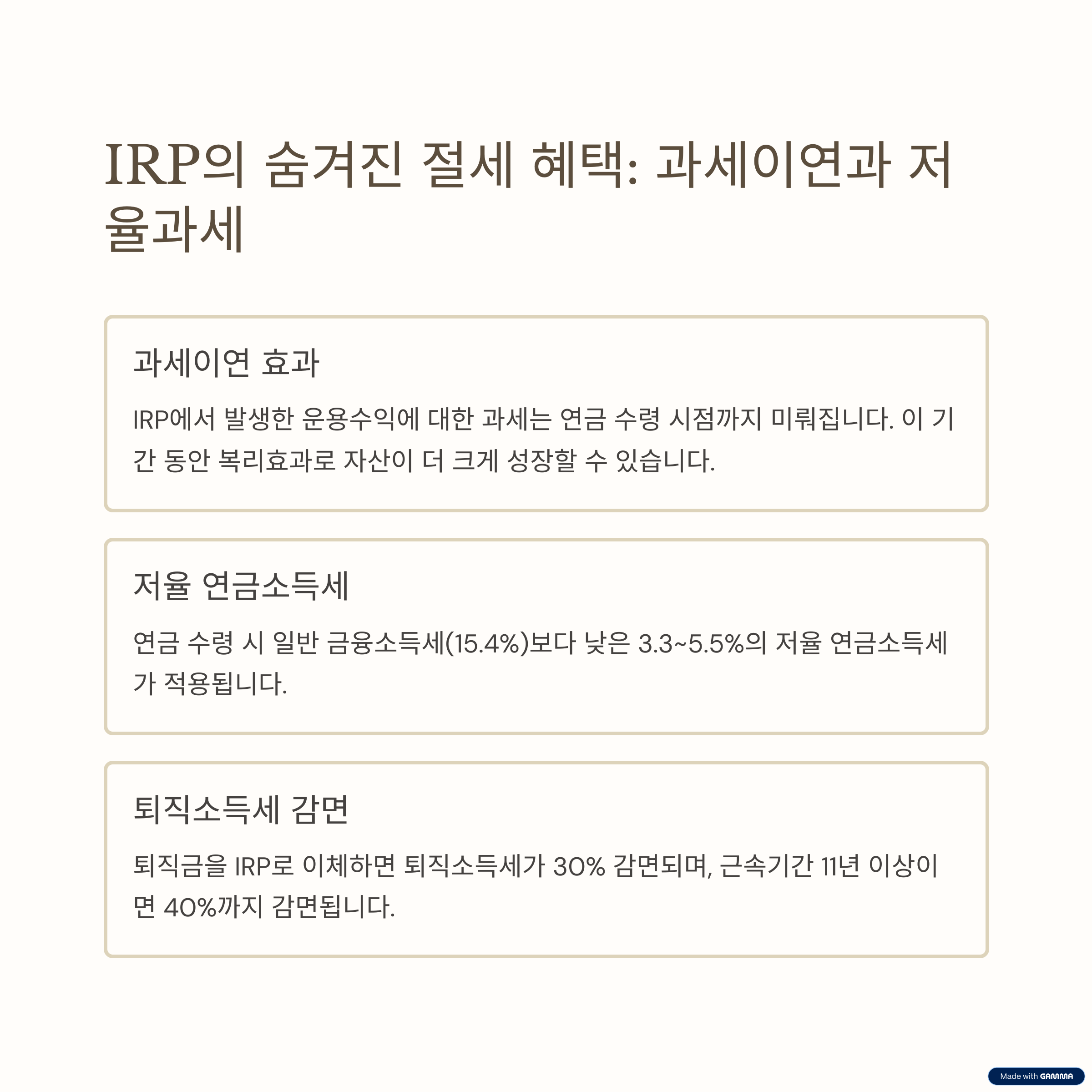 IRP 세액공제는 단순 환급 외에도 과세이연과 저율과세라는 장기적 절세 효과를 제공합니다. 적립한 금액이 운용되며 발생한 수익은 연금 수령 시점까지 과세가 유예되며, 55세 이후 수령 시 일반 소득세가 아닌 연금소득세(3.3~5.5%)가 적용되어 세금 부담을 크게 줄일 수 있습니다. ISA 계좌 만기자금 이체 시 추가 세액공제 혜택까지 누릴 수 있어, IRP는 연금자산관리의 핵심 전략으로 손꼽히고 있습니다.